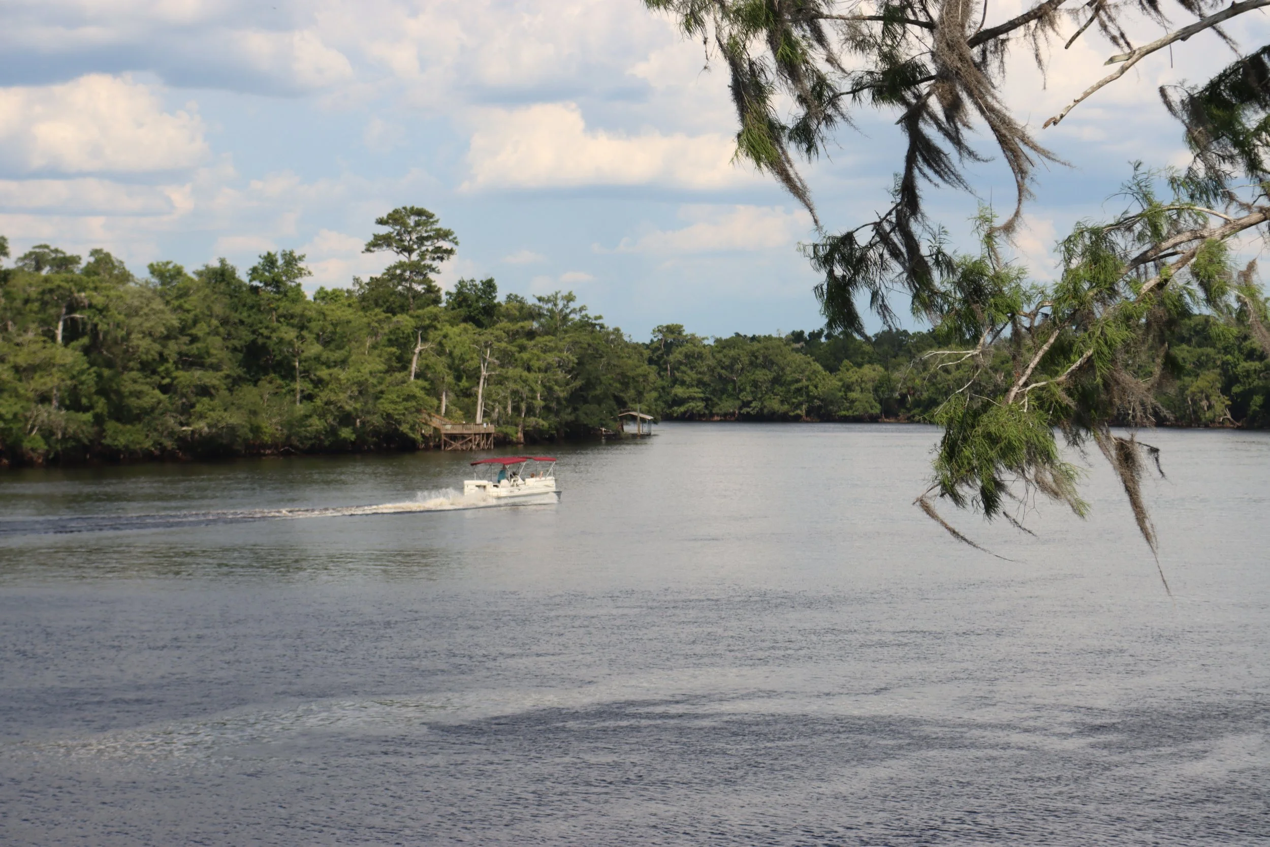 Pontoon and kayak rentals for exploring the Suwannee River, including the sunken steamboat located just a mile and a half upstream.